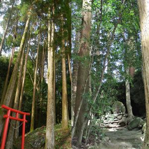 森林の入口には赤色の鳥居があって、その奥に岩石がご神体となってまつられています。スギがまっすぐ天に伸る姿は美しく、雑木林の中を流れる清流は農業用としてつかわれています。近くには市の文化財の田の神像もあり、山の神とともに地域の人々に大切にされています。